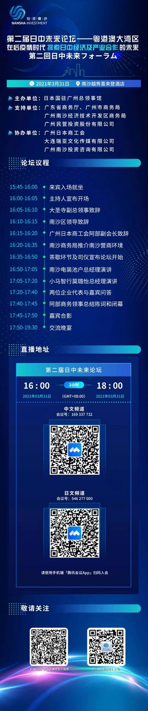 在広州日本国総領事館主催の「第二回日中未来フォーラム」が3月31日に開催予定 令和3年3月30日 在広州日本国総領事館主催の「第二回日中未来フォーラム」が3月31日に開催されます。3月31日16:00にポスターのQRコードをスキャンし、ライブ配信をお楽しみください。