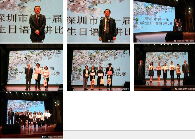 第一届深圳市大学生日语演讲比赛顺利举行 2017/3/31 3月31日,由深圳大学和深圳职业技术学院联合主办,我馆和深圳日本商工会协办的第一届深圳市大学生日语演讲比赛在深圳顺利举行。参加本次演讲比赛的有来自深圳大学和深圳职业技术学院的11名选手。经过激烈的竞逐,来自深圳大学的忠地凤丽同学荣获一等奖,深圳职业技术学院的郑剑娜和黄铭锋同学荣获二等奖。