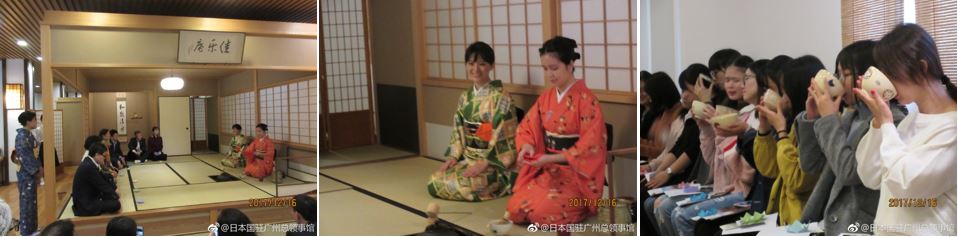 日本茶道交流会が広東外語外貿大学茶室「佳楽庵」において開催 平成29年12月16日 12月16日,当館及び広東外語外貿大学の共催による日本茶道交流会が「佳楽庵」において開催されました。「和敬清寂」のお茶席の雰囲気の中,茶道裏千家の広州在住の岩間宗恭講師の指導の下,広東外語外貿大学茶道部の教員と学生がゲスト達に茶道を実演しました。