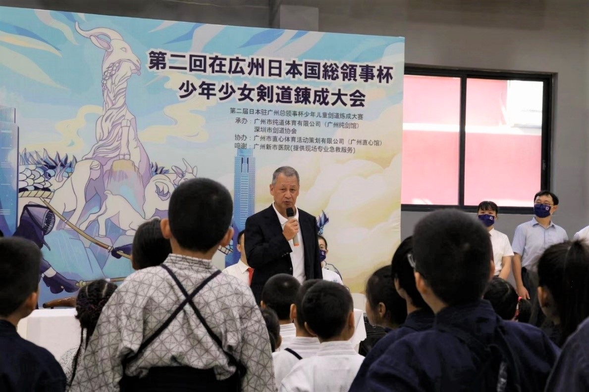 7月23日,龟井总领事出席了在广州市内举办的第二届日本国驻广州总领事杯少年儿童剑道练成大赛开幕式并致辞。