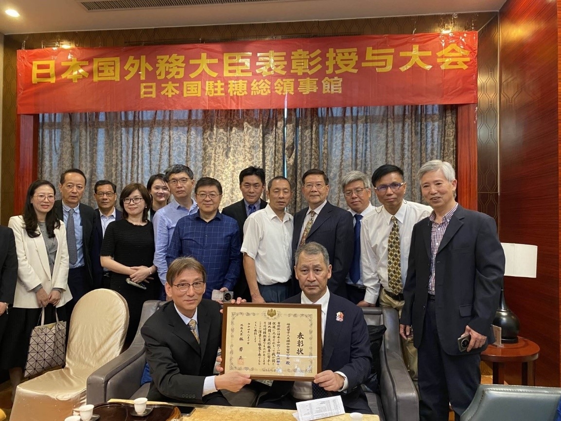 龟井总领事向福建留学人员联谊会留日分会颁发外务大臣表彰 2023/4/22 4月22日,龟井总领事向福建留学人员联谊会留日分会颁发外务大臣表彰。福建留学人员联谊会留日分会是由福建省留日归国人员所组成的团体,自2010年11月6日成立以来,作为日中两国友好的桥梁,长期以来为推动日中之间的人员交流、经济・文化和学术的交流做出了重要贡献,为此特向其颁发表彰。