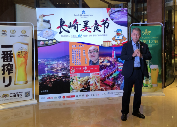龟井总领事出席长崎美食节并致辞 2023/3/9 3月9日,龟井总领事出席了由广州日航酒店主办、本馆后援的“长崎美食节”(3月9日至31日)媒体发布会活动并致辞。龟井总领事对活动致以祝贺,并表示期待通过地方魅力宣传活动促进日中友好交流。主办方在本次发布会上,不仅展销了从日本长崎县进口的水产品和特产,还举办了长崎县金枪鱼的解体秀,吸引了众多观众参与,气氛活跃。