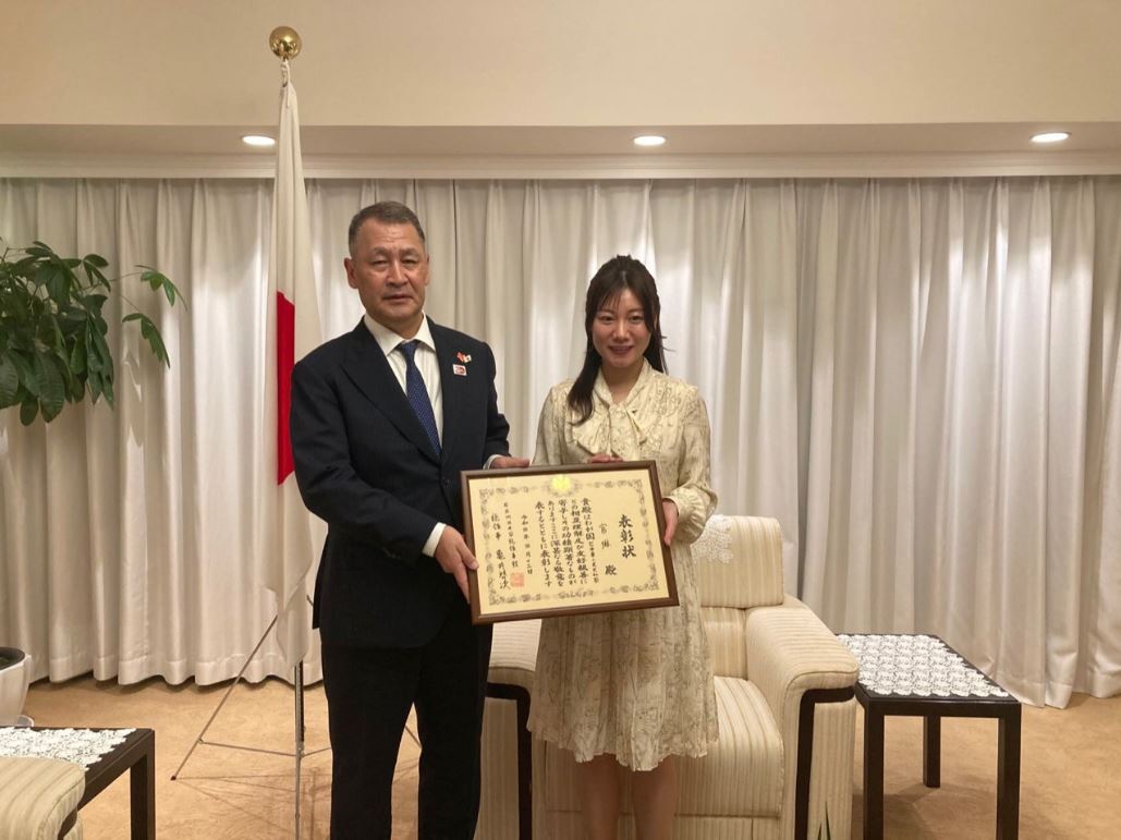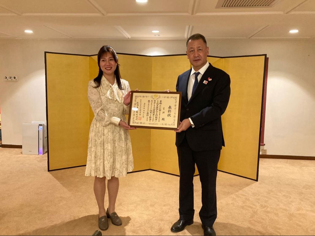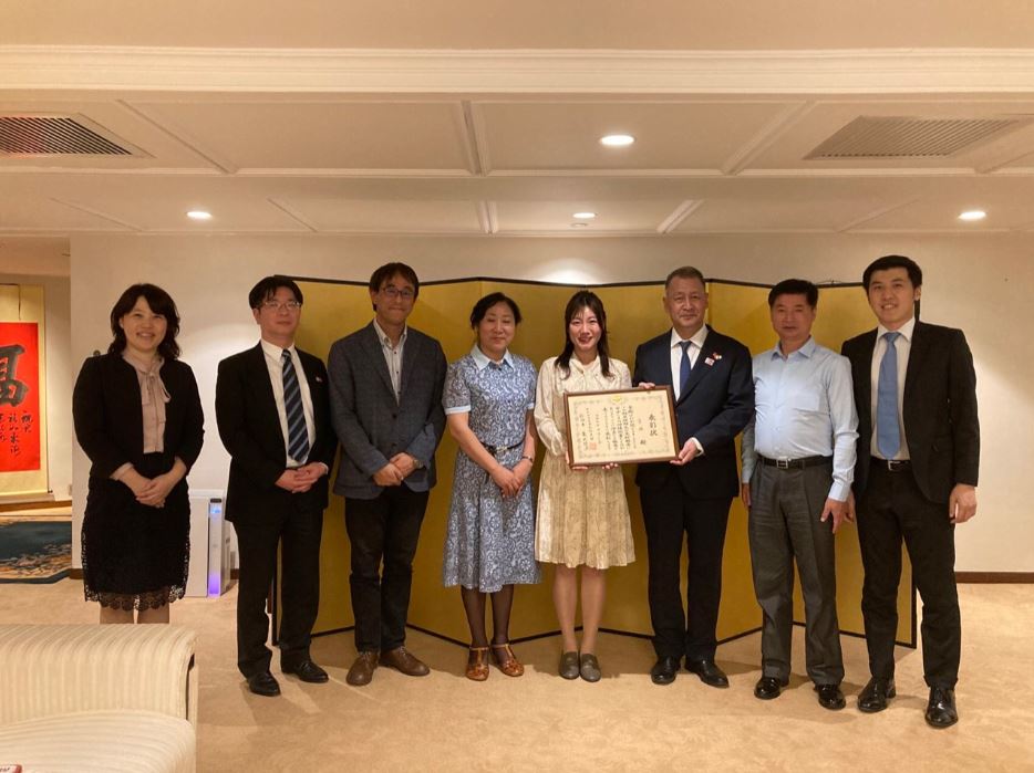 龟井总领事向官琳女士颁发在外公馆长表彰