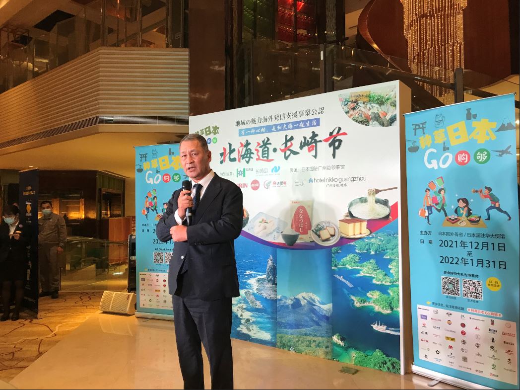 龟井总领事出席“北海道长崎节”发布会活动并致辞 2021/12/1 12月1日,龟井总领事出席由广州日航酒店主办、我馆以后援名义参与的“北海道・长崎节”(12月1日~12月31日)发布会并致辞。该活动入选日本“地区魅力海外宣传支持项目”。在活动现场,除了能够品尝到北海道和长崎的美食以外,还可以选购两地的地方特产。